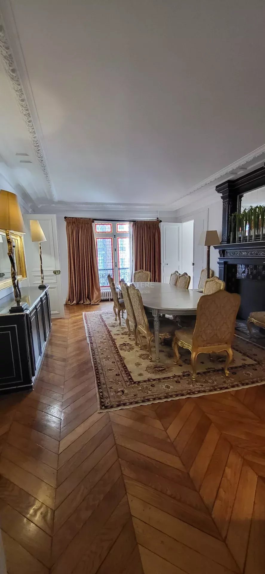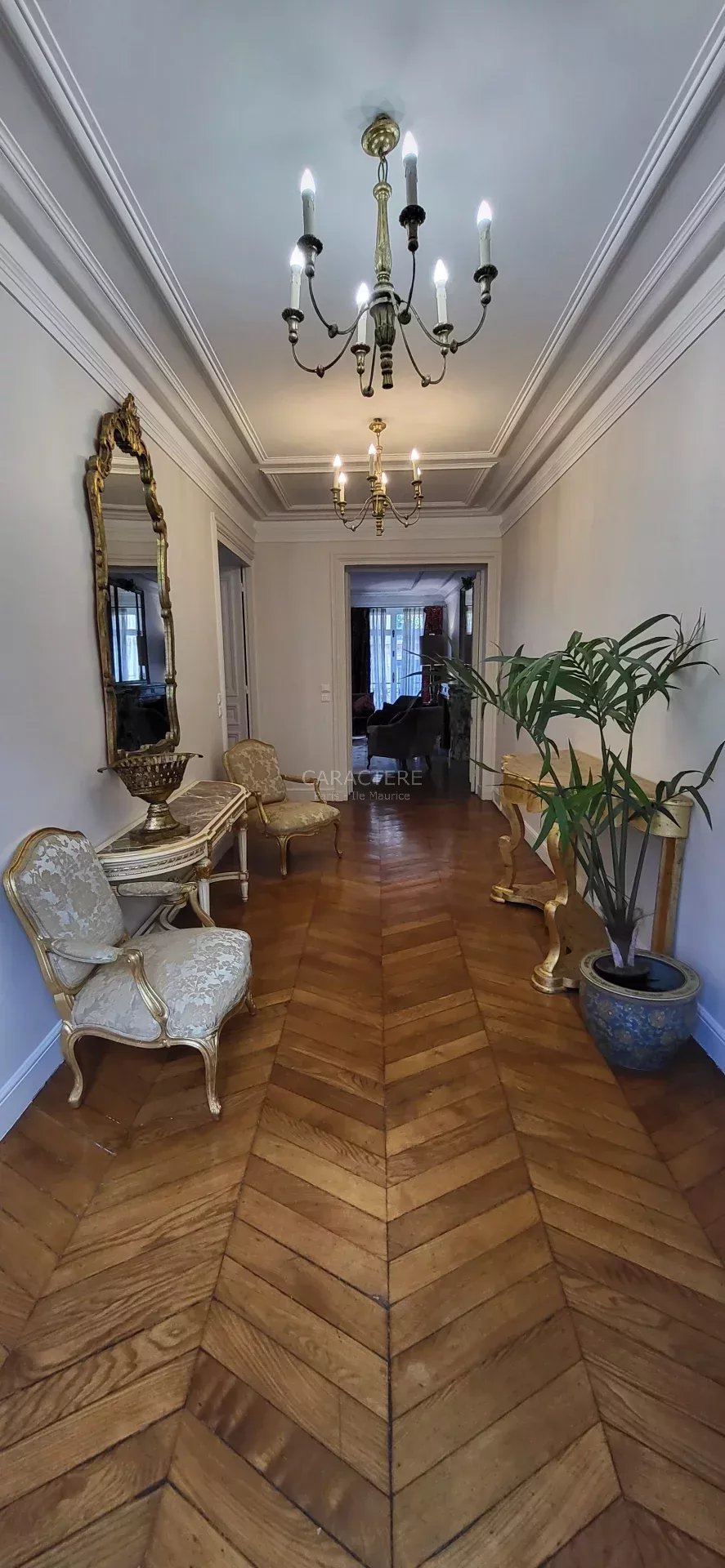 Charme de l'ancien : parquet, moulures, cheminées et belle hauteur sous-plafond.